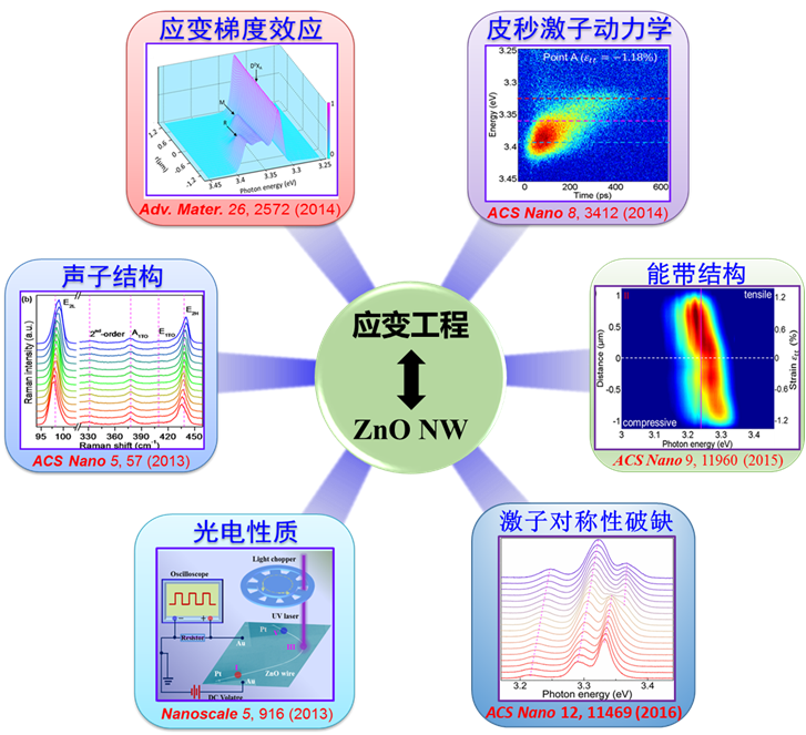 1. 高时空分辨阴极荧光技术和弹性应变对纳米半导体电子结构及激子动力学特性的调制及应用 在原子/纳米尺度精确调控功能纳米半导体的电子结构和载流子动力学特性是提升其物性的关键,也是进一步开发高性能光伏器件、光电探测器和光电晶体管等产品的基础。弹性应变可连续改变半导体的晶格常数及结构,被视为可连续调控半导体物性最具潜力的方式之一,例如应变效应晶体管等。因此,在原子/纳米尺度研究应变对半导体电子结构及载流子动力学的调制规律,对提升半导体物性及产品应用具有十分重要的意义。代表性研究成果如下 (见下图) : 1)基于微纳加工与显微操纵技术,解决了针对一维微纳米材料进行精确可控的标准三点、四点弯曲及单轴拉伸等弹性应变加载的技术难题 (专利号 CN103663354B)。结合原位拉曼光谱探测,首次发现了弹性拉、压应变对ZnO纳米线声子的选择性线性调制和尺度依赖效应 (ACS Nano 7(10), 8891 (2013)); 2)结合高空间分辨阴极荧光探测,系统揭示了弹性拉、压应变分别对ZnO电子能带结构及激子发光能量的线性红移与蓝移调制规律及相关物理机制 (ACS Nano 10(12), 11469 (2016); ACS Nano 9(12), 11960 (2015)); 3)基于超快扫描电子显微镜,发展了全球时空分辨率最高的阴极荧光系统 (~10ps和~20nm时空分辨率)。首次在皮秒和纳米时空尺度观测到了应变梯度场对激子(束缚的电子-空穴对)的驱动效应,确立了半导体中一直备受争议的应变梯度效应及背后物理机制 (Advanced Materials 26, 2572-2579 (2014); ACS Nano8(4), 3412-3420 (2014); Appl. Phys. Lett. 107 (14), 141101 (2015); Science China Materials 57, 26-33 (2014)) 。并发展了一系列基于应变纳米半导体的高性能光电子器件 (Scientific Reports 5 (2015); Appl. Phys. Lett. 105 (7), 073103 (2014); Nanoscale 5, 916 (2013); Appl. Phys. Lett. 100, 22, 3114 (2012); Appl. Phys. Lett. 99, 21, 3107 (2011)),展示了该效应在力、电、光领域的巨大应用潜力。
