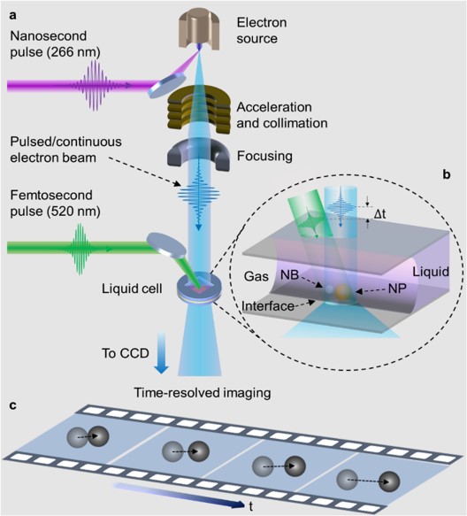 2)通过进一步优化该原位4D技术的性能,研究了水中纳米金颗粒在飞秒激光作用下表面等离激元激发与光热能量转化等动力学过程。首次在纳秒和纳米时空尺度下观察到了纳米金颗粒周围表面等离激元纳米气泡的产生、膨胀和湮灭过程,以及纳米金颗粒在此纳米气泡驱动下的弹道输运和随机游走等动力学行为,提出了一种针对液体环境中纳米机器人的光诱导等离激元气泡驱动机制 (Science Advances 3, e1701160 (2017); ACS nano 15 (4), 6801-6810 (2021))。并进一步成功捕捉到了水中纳米金颗粒之间表面等离激元诱导的团聚与熔合等不可逆物理与化学反应超快动力学过程 (J. Phys. Chem. Lett. 9, 4045(2018))以及GaAs纳米线/金纳米球体系的多元共金反应不可逆超快动力学过程(Proc. Natl. Acad. Sci. U.S.A. 201708761(2017);Nano Letters19 (2), 781-786 (2019))。