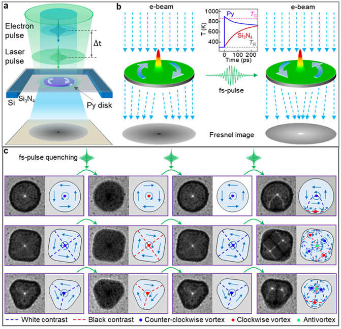 2. 4D超快洛伦兹电子显微镜技术及其在磁性功能纳米材料磁化动力学研究中的应用 复杂电磁环境下的许多电子强关联材料中发生的超快相变动力学过程一直是人们研究的热点和难点,如超导材料的超导相变和磁性材料的磁化-反磁化动力学过程等。这些复杂动力学过程直接决定了材料的物性和相关器件性能。代表性研究成果如下: 1)基于4D超快透射电子显微镜和洛伦兹成像原理,发展了4D超快洛伦兹电子成像技术 (见下图),突破了如超快光学和超快X射线等传统超快磁性成像技术空间分辨率的限制。首次在纳米尺度下实时观察到了不同对称性纳米磁盘中拓扑磁涡旋的超快光致磁化反转动力学行为,并揭示了其磁化反转动力学过程与纳米磁盘微观结构和拓扑序参数间的关系,由此提出了一种基于纳米磁涡旋光热效应的新型快速高密度数据存储方案 (Science Advances 4,eaat3077(2018))。该研究拓展了4D超快透射电镜技术在磁性纳米功能材料超快磁化动力学研究中的应用。