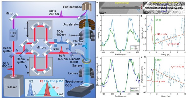 4. 基于双光子调制的4D超快电子显微镜技术及其在Mott绝缘体超快动力学中的应用 四维超快电子显微镜(4D UEM)以其超高的时空分辨率被广泛应用于超快结构动力学分析,但由于光阴极发射的电子存在能散,且在自由飞行过程中存在较强空间电荷作用,导致其时间分辨率被限制在数百飞秒量级,远大于材料中电子运动的时间尺度(数十飞秒)。近年来,几种电子脉冲压缩方案(如射频压缩、太赫兹压缩等)被提出可进一步提高4D UEM的时间分辨率,但是数十飞秒与纳米时空尺度的成像至今尚未实现,成为4D超快电子显微镜技术进一步发展的关键。为此,我们提出了一种基于自由电子-光子相互作用的新型双色超快泵浦-探测方案,将四维超快电镜的时间分辨提升了一个数量级,在飞秒与纳米时空尺度揭示了单个Mott绝缘体VO2纳米线的绝缘体-金属相变动力学过程(Nature Communications 11 (1), 1-11(2020))。