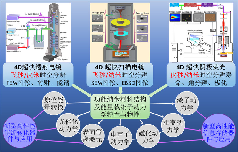 研究方向研究领域简介 物质的微观结构及其相关动力学行为从根本上决定了其物理与化学性质及潜在的功能和应用。例如功能纳米材料和人工纳米结构在能源转化、信息存储等应用中发挥作用时,其微观结构都发生着一系列复杂的物理和化学变化,涉及到形貌演化、结构相变、电荷转移、价态变化等动力学过程。这些动力学过程许多发生在飞秒(10-15 s)至纳秒(10-9 s)尺度。因此,在原子、分子尺度实时地观察物质微观结构的超快动力学过程一直是材料、物理、化学和生物等研究领域追逐的目标,也是深入理解其物性和开发新产品的关键。4D超快电子显微镜结合了电镜的超高空间分辨率和飞秒激光的超快时间分辨率,为研究物质的微观结构及其相关动力学行为提供了无限可能。其自2005年于加州理工学院(Caltech)诺奖得主Ahmed Zewail教授课题组诞生以来,已经在上述多个研究领域产生众多重要应用,成为电子显微学领域一个快速发展的新兴方向。 在南开大学的大力支持下,我们建立了一个国际一流的综合性4D超快电子显微镜实验室,自主设计搭建了最新一代的4D超快透射电子显微镜(4D UTEM)、超快扫描电子显微镜(USEM)、超快阴极荧光(TRCL)、微区瞬态光谱及成像(TA/TRPL)、时间分辨的磁光探测(TR-MOKE,RMCD)等超高时空分辨电子、光子成像与探测系统,旨在探索最小和最快的未知微观世界。课题组长期从事4D超快电子显微镜技术和原子/纳米尺度的超快动力学及物理研究,重点关注和发展先进的新型原位4D UTEM、USEM、TRCL、TAM、TR-MOKE等超高时空分辨的电子、光子成像与探测技术,在空前的时空尺度下研究量子与纳米功能材料在能源转换、信息存储与传输等真实应用中的形貌及晶体结构演化、能量载流子传输与相互作用等超快动力学过程与物理机制,进而开发新器件和新应用。