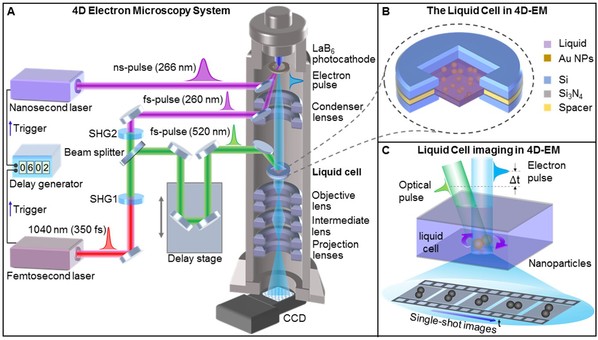 3. 原位液态4D超快电子显微镜技术及其在功能纳米材料超快动力学研究中的应用 在原子尺度观察物质的结构及其演化的超快动力学过程,是理解物理、材料、化学和生物等学科中众多现象的关键,也是科学家们一直追逐的梦想。4D超快电子显微镜结合了电镜的超高空间分辨率和飞秒激光的超快时间分辨率,使得在超高时空尺度下研究物质的结构变化及能量转换等动力学过程成为可能。但受高真空运行环境的限制,该技术只局限于固态体系(含冷冻样品)的动力学研究。因此,开发原位液态、气态环境4D超快电子显微镜技术对于各种复杂环境下功能纳米材料的超快动力学研究极为关键。代表性研究成果如下: 1)开发了一种可在高真空下维持液态环境且对高能电子和激光均透明的超薄液态样品池器件,进而发展了液态环境4D透射电子显微镜技术 。首次在纳秒和纳米时空尺度下捕捉到了液体中纳米颗粒二聚体的超快弹道旋转动力学过程和在长时间尺度下的随机扩散旋转行为,第一次通过实时图像解开了布朗运动在超短时间尺度下的弹道特性这个世纪谜题 (Science 355, 494-498 (2017)。该成果被等众多媒体选为研究亮点进行广泛报道,如Science杂志评论称:“On the way toward a complete recording of biomolecular function in space and time, the success of Fu et al. with nanoparticles is an important milestone.”