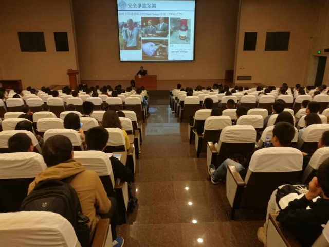 潘雷霆首先用几个真实的例子介绍了生物化学实验操作不当可能带来的危险,让同学们认识到实验安全的重要性,而后潘雷霆从几个方面为同学们详细地讲述了一些实验室的危险药品、实验用具的操作方法、遇到危险时应如何应对以及正确的实验操作,最后,他告诫同学们要“珍爱生命,保护环境。实验室安全,从你我做起。”两个小时的讲座同学们听的兴趣盎然。