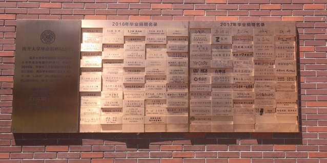 自2016年起,发展办、基金会在津南校区学生文化谷设立南开大学毕业捐赠纪念墙,面向毕业生开展校友砖募集活动,毕业生个人、班级或自定义团体可在毕业生纪念墙上认捐一块“校友砖”进行留名纪念,以此铭记南开时光,镌刻青春梦想。
