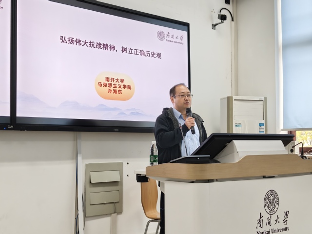 孙海东从历史出发,向同学们阐述了抗战胜利的伟大意义与中国共产党在抗战中的中流砥柱作用,剖析了历史虚无主义的表现及危害,强调树立正确历史观的重要性。孙海东告诉同学们,抗战精神是中华民族的宝贵财富,要从历史中汲取力量,只有学好历史,以史为鉴,才能知兴替、远观未来,明白过去成功的原因,从而知道未来如何成功,在当前面临艰难险阻时,抗战精神能指引我们攻坚克难,实现民族复兴。