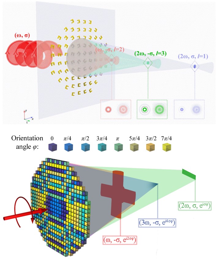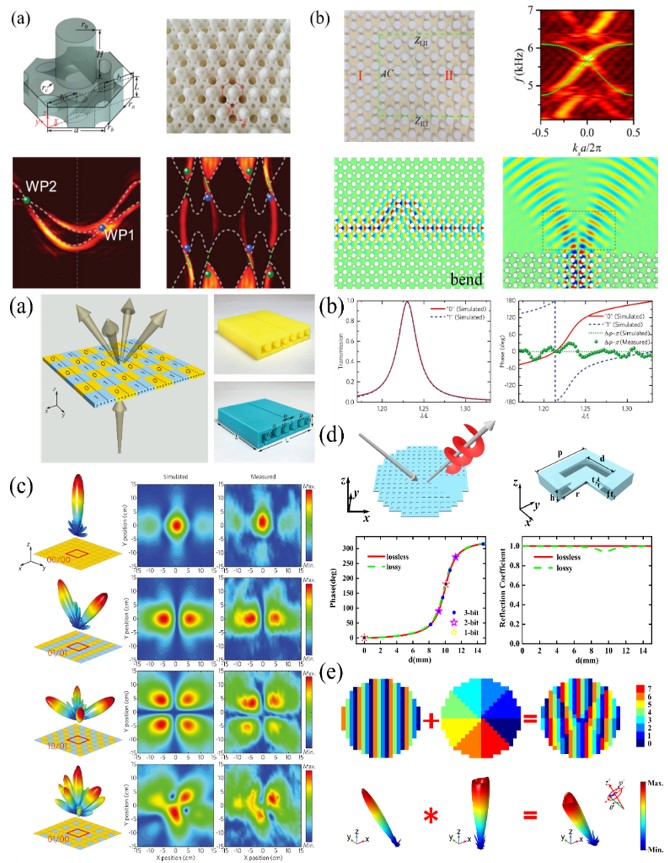 研究方向 人工微结构是一种人工设计的微纳材料,其结构尺寸小于或等于入射波场(如电磁波、声波等)的波长,通常被学术界称为超材料(对于平面型超材料又称为超表面)。与传统体材料不同,人工微结构材料的物理性质并不取决于其组成分子或者原子,而是决定于所设计的“人造原子”,通过任意设计“人造原子”的单元以及排列方式,可以在不违背基本的物理学规律的前提下,获得与自然界中的物质具有迥然不同的超常物理性质的“新物质”,进而发展自然材料难以实现的新奇物理效应——如负折射、光学隐身、异常折射、光子霍尔效应等。迄今发展出的人工微纳结构材料多与光、声、电、磁、热等性质相联系,为人类新材料、新技术的突破提供了一个新契机。同时,人工微纳结构材料也在军事领域具有非常广阔的应用领域,它已被评为美国国防部2013-2017年科技发展“五年计划”中重点关注的六大颠覆性基础研究领域之一,美国国防部先进研究项目局(DARPA)把人工微结构定义为“强力推进增长领域”,美国空军科学研究办公室(AFOSR)将其列入“十大关键领域”;Science杂志也分别在2003年和2006年评选此人工微纳材料为“十大科学进展”。 人工微结构波场调控是指利用人工微纳结构在亚波长尺度对波场的偏振、振幅、相位、频率等性质进行高度定制化的调控,为发现新效应和新现象、开发新器件和开拓新应用提供了重要途径。开展人工微纳结构波场调控研究,不仅有助于深刻理解波场与物质相互作用,而且对其它学科或领域的发展具有重要的推动作用。我们课题组主要针对人工微纳结构材料在光场、声场等波场调控领域的新物理效应、新技术应用进行系统性研究。 ![]() 图1 利用亚波长乃至深亚波长尺度的人工微结构与波场发生明显的相互作用, 1. 人工微结构光场调控实现对光场频率、振幅、相位和偏振态等多个维度的自由操控,进而获得小型化、轻质化和集成化的光学器件是目前国际上微纳光学和信息光学领域的重要研究内容。超表面作为一种人造“光学原子”,为实现对光与物质相互作用的增强和操控提供了一种有效手段,为在微区实现对光场的高效调控提供了一种全新的方式,是新世纪以来微纳光学研究领域中备受关注的前沿方向。利用超表面不仅能够实现对光波频率、振幅和偏振态的灵活操控,同时还能够在亚波长尺度下实现对光场相位的有效控制,因此超表面在光场操控方面具有广泛的应用前景和应用价值,相关研究为微纳光学领域光学器件未来的研究、设计和发展提供了无限的可能性。实现对光场在不同维度下的灵活控制是目前超表面研究领域的热门方向,由此产生的新的光学现象和性能优异的光学器件开始受到人们越来越多的关注。近年来,我们在超表面光场偏振态、相位、振幅和多维度联合调控方面取得了一系列研究进展,揭示了超表面在光场调控研究领域巨大的研究潜力和广阔的应用前景 [Adv. Mater. 31, 1802458 (2019);Adv. Mater. 31, 1805912 (2019)]。例如我们利用人工微结构在亚波长尺度下直接操控光场相位的方式,在非手性微结构中实现了可控旋光,相比于传统的旋光方式,这种非手性微结构可以通过对微结构单元结构参数的有序设计,实现对旋光度大小更加直接、灵活的控制 [Light: Sci. & Appl. 5, e16096 (2016)];我们基于单层交错纳米天线人工微结构阵列,提出了一种具有广泛适用性的超表面二分之一波片设计方法,实现了偏振转换角与波长无关的宽带二分之一波片 [ACS Photonics 4, 2061 (2017)];我们在提出多棒能级杂化及镜像理论的基础上,通过增加微结构单元中金属棒的数量将几何相位的调控效率提高至理论极限,同时有效地扩宽了微结构的响应带宽 [Adv. Funct. Mater. 25, 5428 (2015)];我们提出了一种全新的金属棒微结构设计,通过增加金属棒的厚度产生了新的共振模式,进而在1067 nm波长下实现了对入射光场在金属棒长轴方向上p的相位延迟,并实现了效率高于70%的光子自旋霍尔效应 [Adv. Opt. Mater. 5, 1700413 (2017)];我们通过对亚波长金属天线微结构的结构参数和旋转角度的合理设计,实现了对出射光场相位和振幅的联合调控,进而实现了高质量艾里光束的生成 [Adv. Opt. Mater. 4, 1230 (2016)]。 图2. (a)人工微结构的形状可以任意裁剪,不同的微结构形状与光场相互作用时具有不同的本征模式;(b)利用人工微结构实现光场单维度与多维度联合调控;(c) 基于人工微结构可以实现不同的多功能超表面技术。 2. 少层微结构光场调控光学人工微结构的提出掀起了光学领域的一场革命,大大拓展了人类操纵光场的手段与能力。其中,三维的体超材料可以实现传统自然材料难以实现的功能,比如负折射等,但这类超材料通常损耗较大且难以制造。作为体超材料的一种延伸与革新,二维超表面一经提出便引起了研究者们的广泛关注。它易于制造,并且可以在亚波长尺度对光场的偏振、振幅、相位、频率等性质进行调控。但单层的超表面可调控的自由度相对较少,渐渐难以满足人们对更多功能和更新颖功能的设计需求。近年来,少层超表面逐渐兴起。相对于体超材料,它不仅保持了单层超表面易于制造且损耗较小的优点,而且大大增加了可调控的自由度。更重要的是,少层超表面有着丰富的层间效应,比如近场耦合效应、波导效应、多波干涉效应等,这使得少层超表面能够超